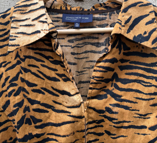 JONES NEW YORK TIGER PRINT ZIP-UP BLOUSE