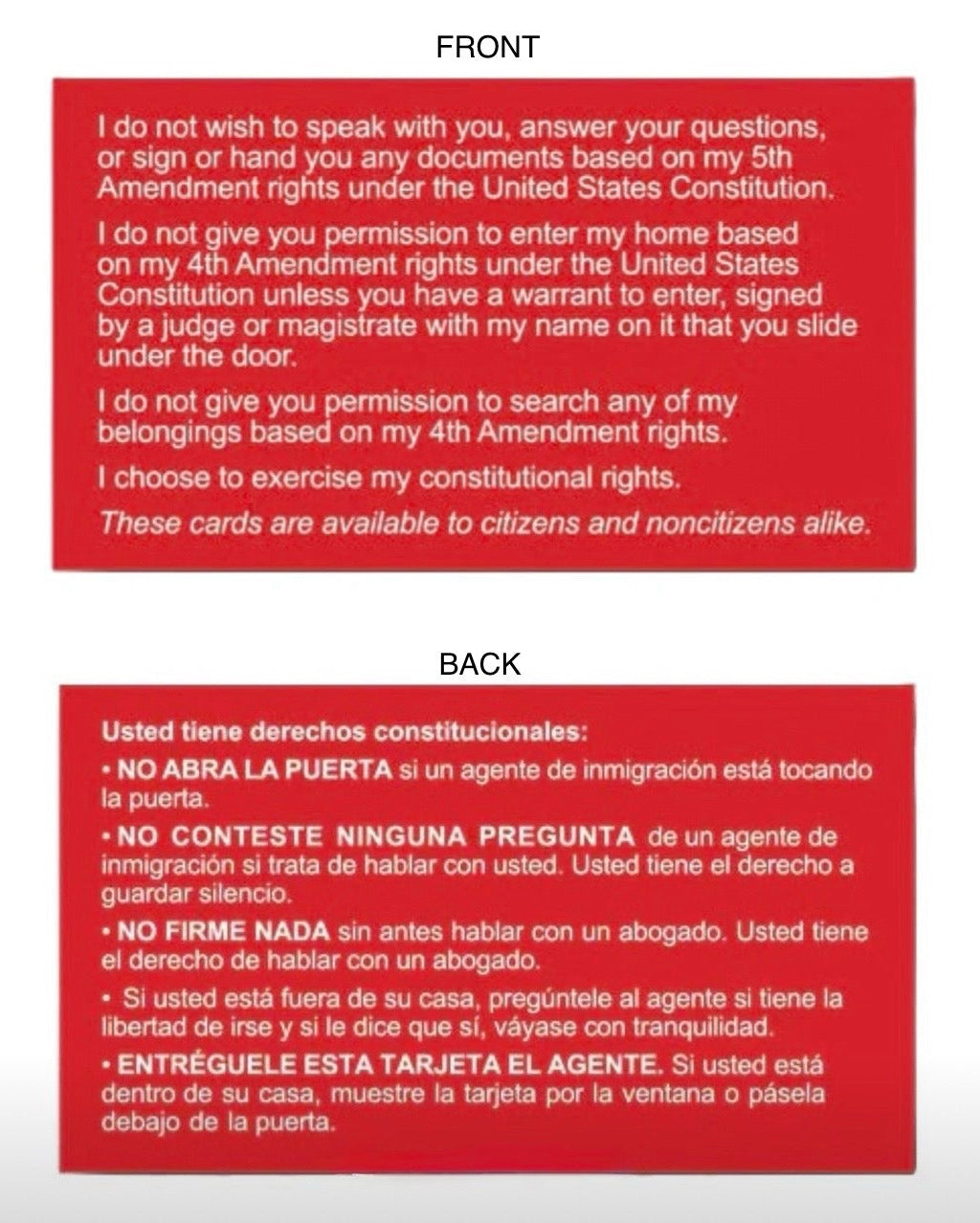 Front: Printed Constitutional Rights Card featuring the 4th, 5th, and 15th Amendments