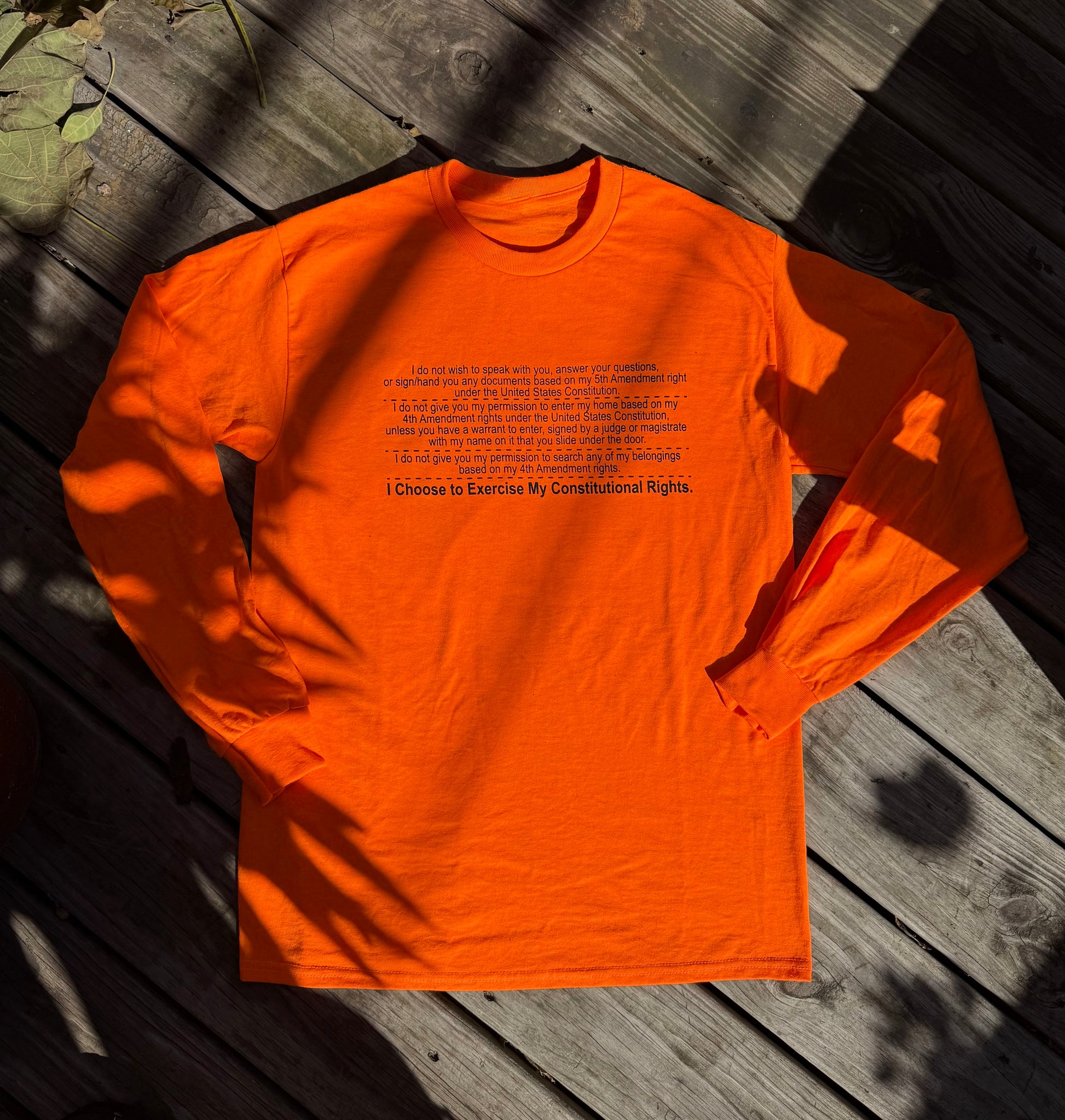 Our signature construction-orange workwear tee delivers bold style with purpose. Designed for comfort and durability, it combines everyday utility with a message rooted in rights and resistance. With every purchase, you’ll receive a “Know Your Rights” red immigration card — written in English and Spanish — to keep or hand to someone in need.